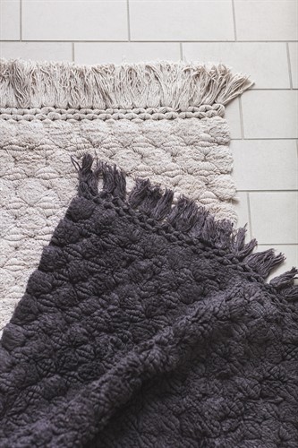 Plain stylish cotton bath mat with fringes on the short sides. Available in four colors.