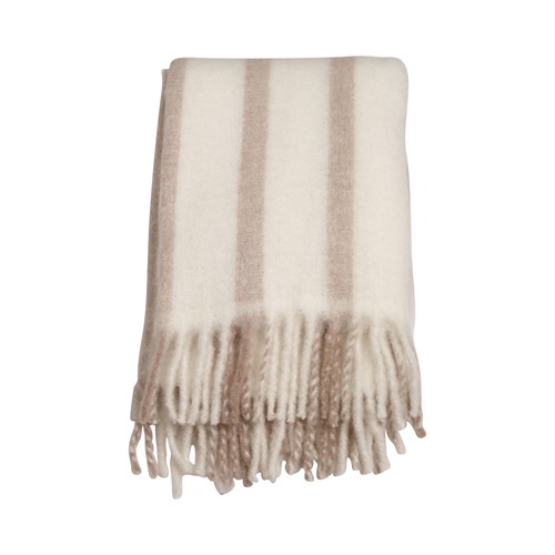 Soft thicker plaid in a brushed wool blend with fringes. Striped to match the solid Morgan.