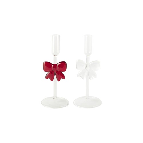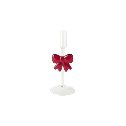 Vacker ljusstake i glas med dekorativ rosett. Finns även med rosetten i klarglas