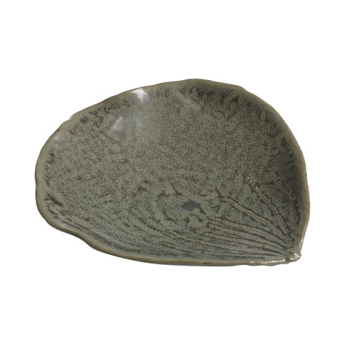 Grönt litet fat i stengods. Format som ett blomblad. Vacker att lägga det mesta på.