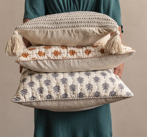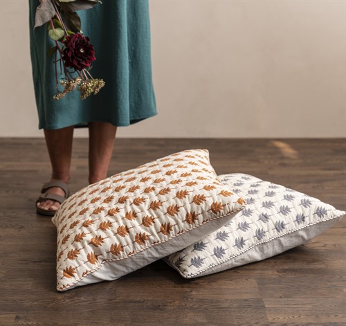 Härligt printat kuddfodral i bomull/linne kvalitet med dekorativ söm i bomullsgarn och enfärgad baksida. Piping runtom och dold dragkedja i nederkant.