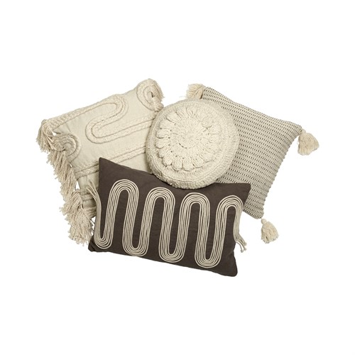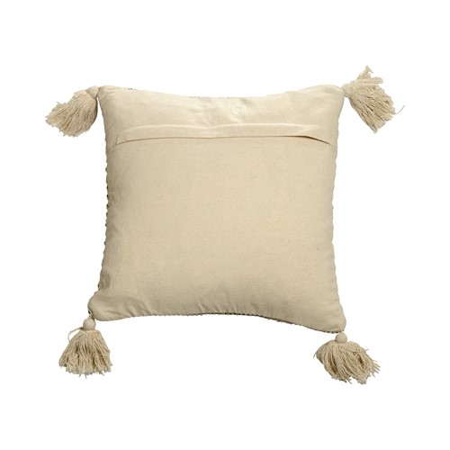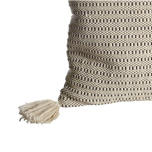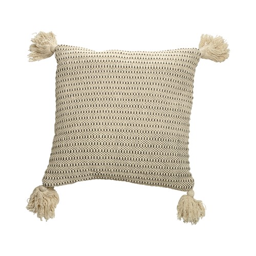 Snyggt kuddfodral i bomull med garnfärgat mönster i svart och tofsar i hörnen.